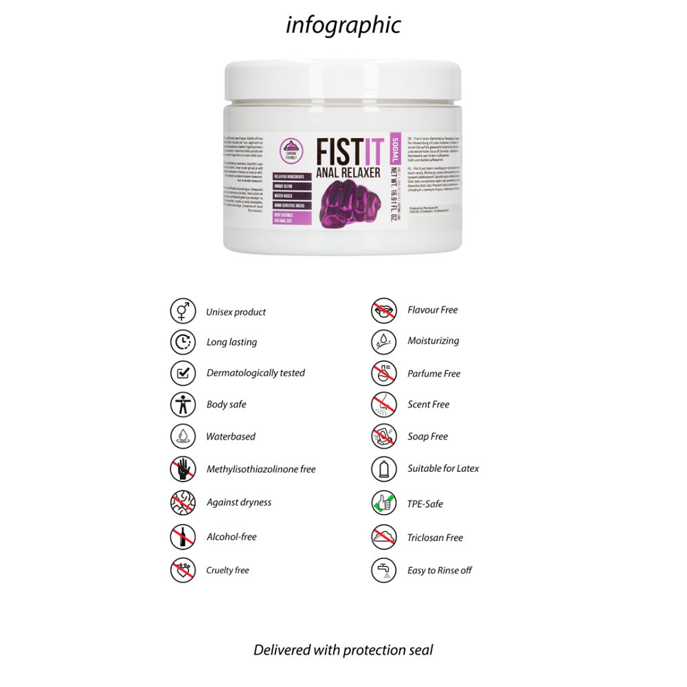 Fist It is a water-based lubricant. Suitable for use with latex condoms. Dermatologically tested, fat-free, colourless, odourless and tasteless.
