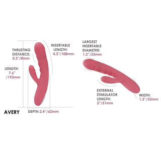 Fill yourself and gorge on Avery's delightful thrust. Featuring multiple modes and intensities, Avery offers an experience tailored to your preferences. You are in total Control as you make each experience memorable with Avery's thrusting and vibrating heads. Use them in tandem for a world shaking experience, or stick to one to carry you over the edge and into bliss.